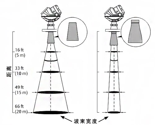 雷達(dá)液位計(jì)的總波束寬度與設(shè)備的頻率成反比。因此對(duì)于同一直徑的天線,如果雷達(dá)液位計(jì)的頻率提高,波束寬度將低于較低頻率的設(shè)備,狹窄的波束可將管嘴、罐壁和干擾物的影響降至ZUI低。如下圖所示(左側(cè)是6 GHZ的,右側(cè)為26GHZ的)。