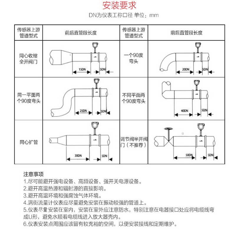 5、直管段要求:至少保證流量計(jì)前15倍管徑,流量計(jì)后5倍管徑。如流量計(jì)前有彎頭,縮進(jìn),擴(kuò)大等干擾源,則需保證流量計(jì)前30-40倍的管徑,流量計(jì)后6倍管徑。流量計(jì)應(yīng)安裝于調(diào)節(jié)閥,壓力或溫度傳感器的上游。