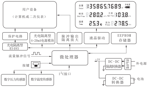 7、按流量頻率信號,可將儀表系數(shù)分八段自動進(jìn)行線性修正,可根據(jù)用戶需要提高儀表的計量精度。 •釆用LCD顯示,清晰直觀,讀數(shù)方便。