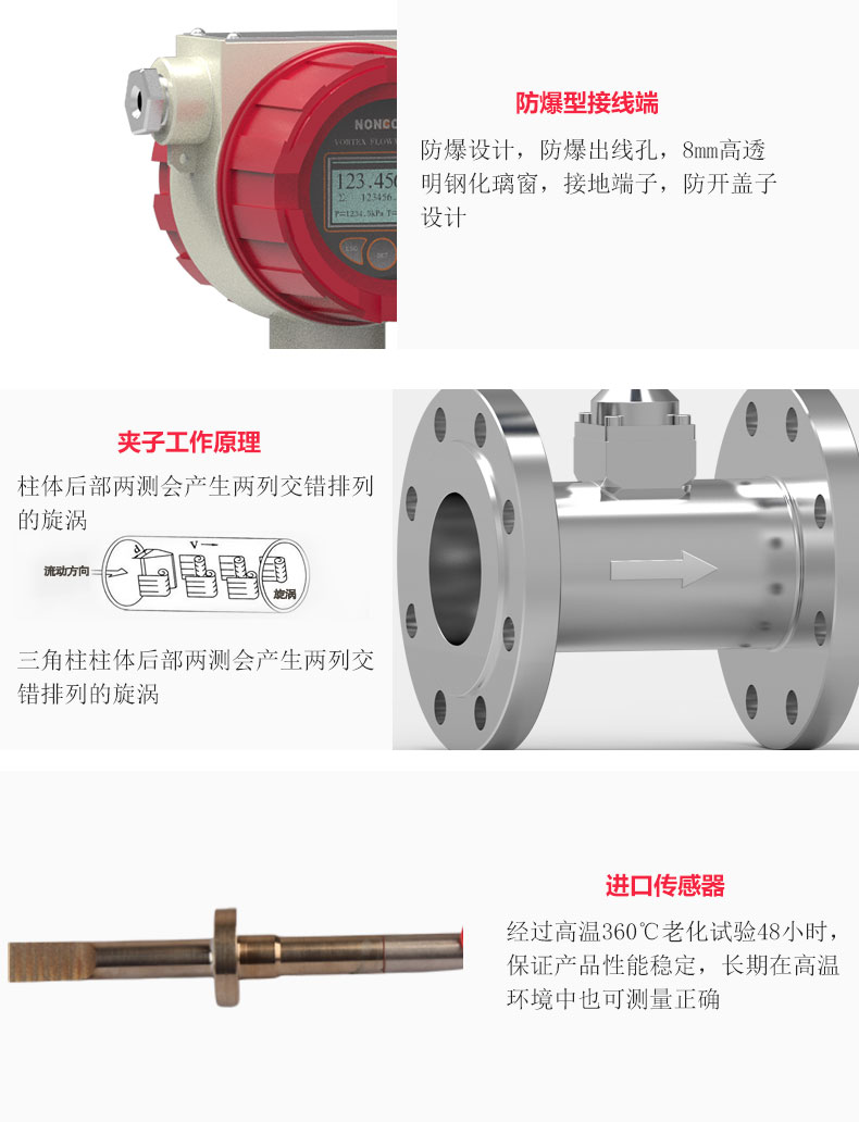 渦街流量傳感器得旋渦釋放頻率是由旋渦交替地作用于檢測(cè)傳感器(探頭)上地應(yīng)力通過(guò)在它內(nèi)部地壓電元件來(lái)檢出地。