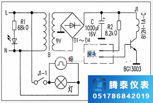 市電通過(guò)變壓器B與二次電源耦合。經(jīng)過(guò)整流濾波后,電容器C兩端產(chǎn)生12V直流電壓。該電壓通過(guò)繼電器線(xiàn)圈施加到三極管集電極上