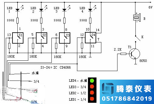 該電路由四路模擬開(kāi)關(guān)IC CD4066組成。每個(gè)電路有四個(gè)獨(dú)立的開(kāi)關(guān),可以控制數(shù)字或模擬信號(hào)的傳輸。水箱無(wú)水時(shí),由于180K電阻的作用,四個(gè)開(kāi)關(guān)的控制端為低電平,開(kāi)關(guān)為off,LED不亮