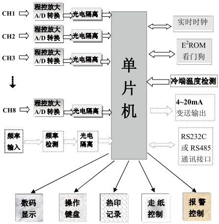每路輸入信號(hào)經(jīng)程控放大,24位分辨率A/D轉(zhuǎn)換,光電隔離送至單片機(jī)處理。從而徹底消除了各輸入通道之間的干擾,消除了輸入通道與CPU之間的干擾。使用高精度數(shù)字溫度傳感器,進(jìn)行熱電偶的冷端溫度補(bǔ)償。為了提高長期穩(wěn)定性,本記錄儀放棄了傳統(tǒng)的用電位器調(diào)整放大倍數(shù)及零點(diǎn)的方法,代之以軟件程序調(diào)校法,并實(shí)現(xiàn)了放大倍數(shù)的程控放大。出廠前廠方對各項(xiàng)參數(shù)均已調(diào)試完成。用戶可通過鍵盤設(shè)定對系統(tǒng)誤差進(jìn)行平移校正。