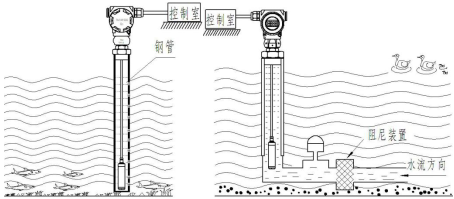 1.當(dāng)在流水中測量水位時,可以將鋼管或PVC管插入水路中,內(nèi)徑為5cm,侵入水中的管道位于反向不同的高度中水流向。 φ5的一個小孔,使水進入管,并在管的出口處固定電纜和接線盒。