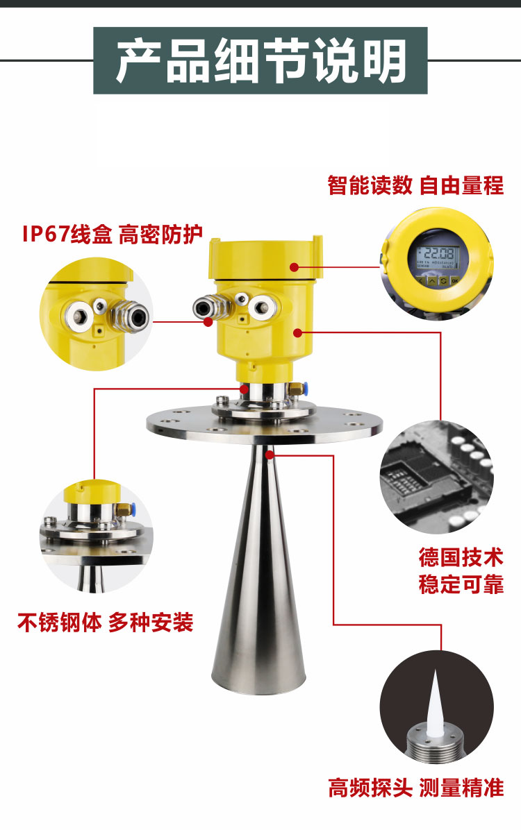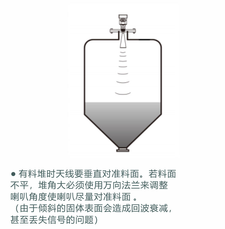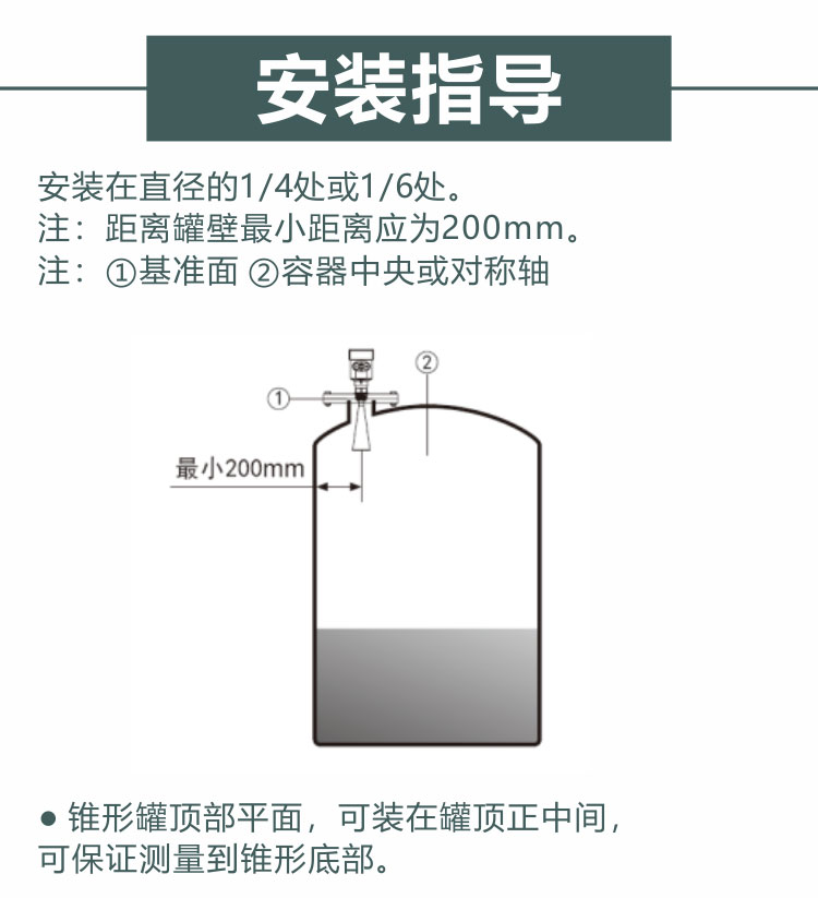 3、理論上測量達到天線*的位置是可能的,但是考慮到腐蝕及粘附的影響,測量范圍的終值應(yīng)距離天線的*至少100mm。