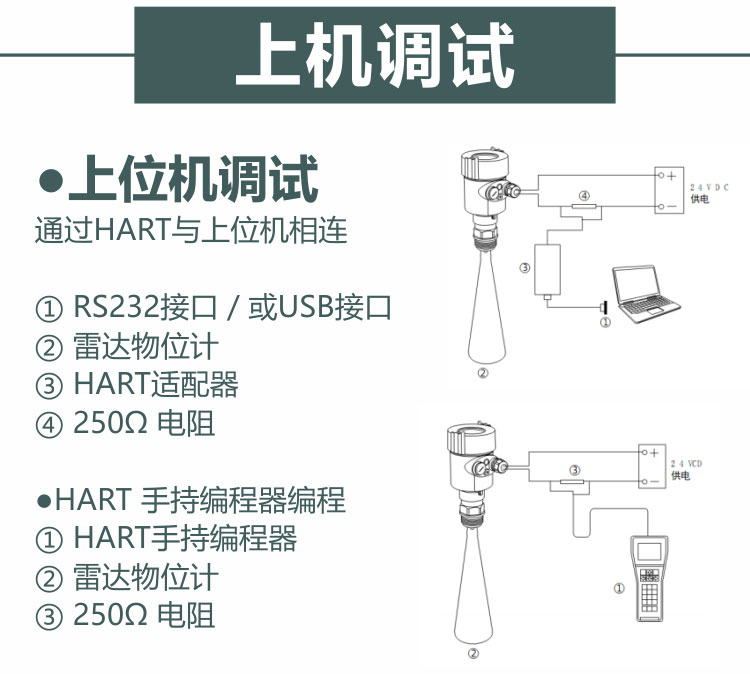 使用軟件調(diào)試的時候,給雷達儀表加電24VDC,同時在連接HART適配器前端加一個250歐姆的電阻。如果一體式HART電阻(內(nèi)部電阻250歐姆)的供電儀表,就不需要附加外部電阻,HART適配器可以和4…20mA線并聯(lián)。