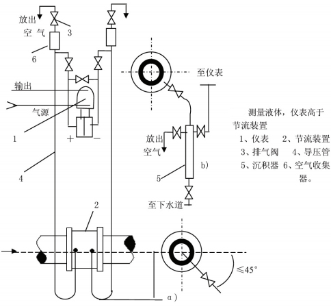 丈量液體流量時(shí)工藝管道水平安裝,差壓變送器的位置 處于節(jié)流裝置下方時(shí),取壓口應(yīng)在節(jié)流裝置的水平中心 軸線下偏45°角引出,這可以消樣除由流體傳放出的氣體進(jìn)入導(dǎo)壓管和差壓變送器。若差壓變送器處于節(jié)流裝置的上方時(shí),除取壓口下偏<45°角然后向 上引導(dǎo)壓管外,應(yīng)在導(dǎo)壓管 上的*高點(diǎn)裝置集器或排氣閥。