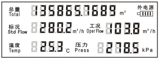 2、總量(標(biāo)準(zhǔn)體積)*小保管小數(shù)后2位,*大值為99999m3/h,當(dāng)超出時,示值呈現(xiàn)閃爍,此時理論值為示值的10倍。