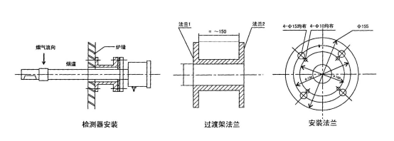 4、爐墻上的氧化鋯探頭固定法蘭裝置時(shí),用鋼材做成如圖外形的過渡架,過渡架的法蘭能直接焊在爐墻處壁上或埋入爐墻中,但請(qǐng)求氣密結(jié)實(shí)。過渡架另一端法蘭是為固定氧化鋯探頭而設(shè),因而必需與氧化鋯探頭固定法蘭的螺孔相匹配。如選用由12mm裝置孔,則將過渡架法蘭的¢125mm圓上均布四個(gè)¢12mm的裝置孔,運(yùn)用4個(gè)M1O×40的螺絲,將它與檢測(cè)器的固定法蘭緊固,為避免漏氣,兩法蘭間可填充橡膠紙板密封圈。