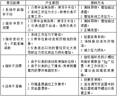 ?。?)金屬浮子流量計玻璃面板損壞擠壓指針卡住。處置方法是:拆開顯現(xiàn)表改換玻璃面板。
