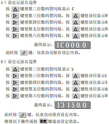 在設定狀態(tài)下,用戶經過對參數(shù)設定,從而肯定各通道的量程、記載范圍、報警及走紙速度、報表打印時間距離、當前時間等等。