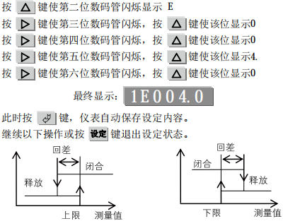 小長圖有紙記載儀上下限報警繼電器的觸點是給用戶聯(lián)接相應的控制電器[如電 磁閥]以組成控制系統(tǒng)時運用。為了避免在報警點左近繼電器觸點產生抖 動現(xiàn)象,儀表采用設定回差的辦法,以消弭繼電器觸點顫動。其提示符是:E