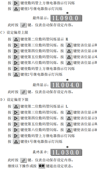 偏向上限是指超越上限的偏向值,實踐報警值=上限+偏向上限。例: 上限為115.0℃,偏向上限為4.0℃ 實踐報警值=115+4=119℃ 偏向下限是指超越下限的偏向值,實踐報警值=下限-偏向下限。