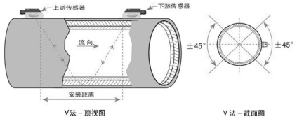 DN15~200mm的管道優(yōu)先選用V法,裝置時(shí)兩傳感器程度對(duì)齊,其中心線與管道軸線平行即可,并留意發(fā)射方向一定相對(duì)(兩個(gè)傳感器方向朝里)。V法具有運(yùn)用便當(dāng),丈量精確的特性。關(guān)于口徑小于DN50mm的管道裝置精度較高,請(qǐng)留意信號(hào)強(qiáng)度、信號(hào)質(zhì)量、傳輸時(shí)間比這幾個(gè)參數(shù)。