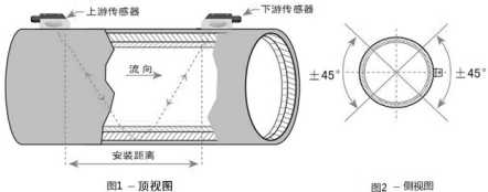 兩個(gè)傳感器應(yīng)該裝置在管道軸面的程度方向上,在45°范圍內(nèi)裝置,以避免上部有不滿(mǎn)管、氣泡或下部有沉淀等現(xiàn)象影響傳感器正常丈量。