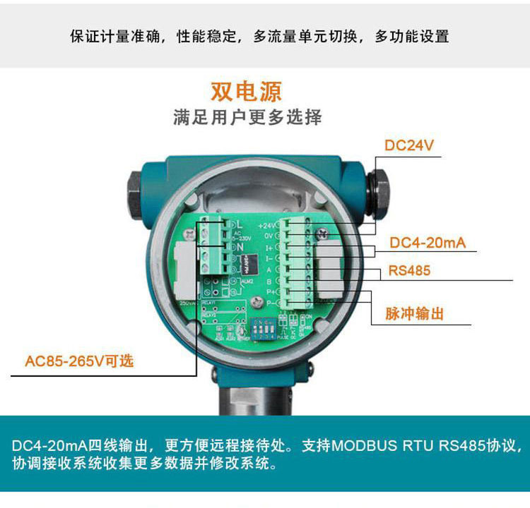 流量計由傳感器,變送器及數(shù)字指示累積器等三部分組成。傳感器由傳感管、電磁驅(qū)動器、和電磁檢測器三部分組成。電磁驅(qū)動器使傳感器以其固有頻率振動,而流量的導(dǎo)入使u形傳感器的作用下產(chǎn)生一種扭曲,在它的左右兩側(cè)產(chǎn)生一個相位差,該相位差與質(zhì)量流量成正比。電磁監(jiān)測器把該相位差轉(zhuǎn)變?yōu)橄鄳?yīng)的電平信號送入變送器,經(jīng)濾波、積分、放大等電量處理后。轉(zhuǎn)變成與質(zhì)量成正比的4-20mA模擬信號和一定范圍的頻率信號兩種形式輸出。