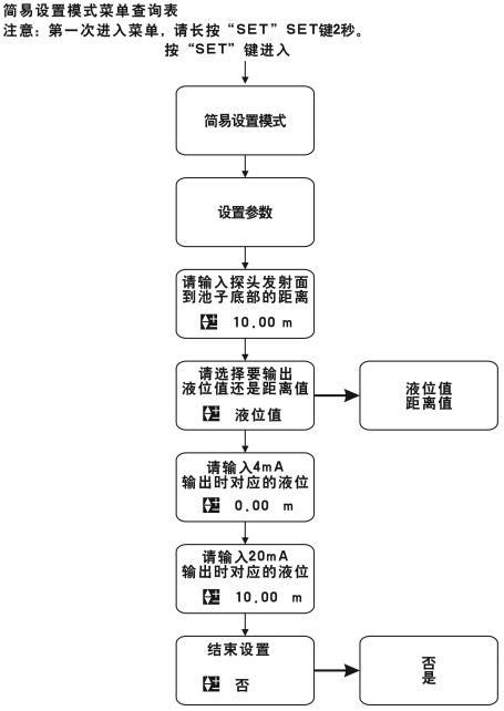 1、超聲波物位計通電顯現(xiàn)后,長按設置鍵(SET)兩秒進入一級菜單。 菜單形式有:專家設置形式和簡易設置形式。